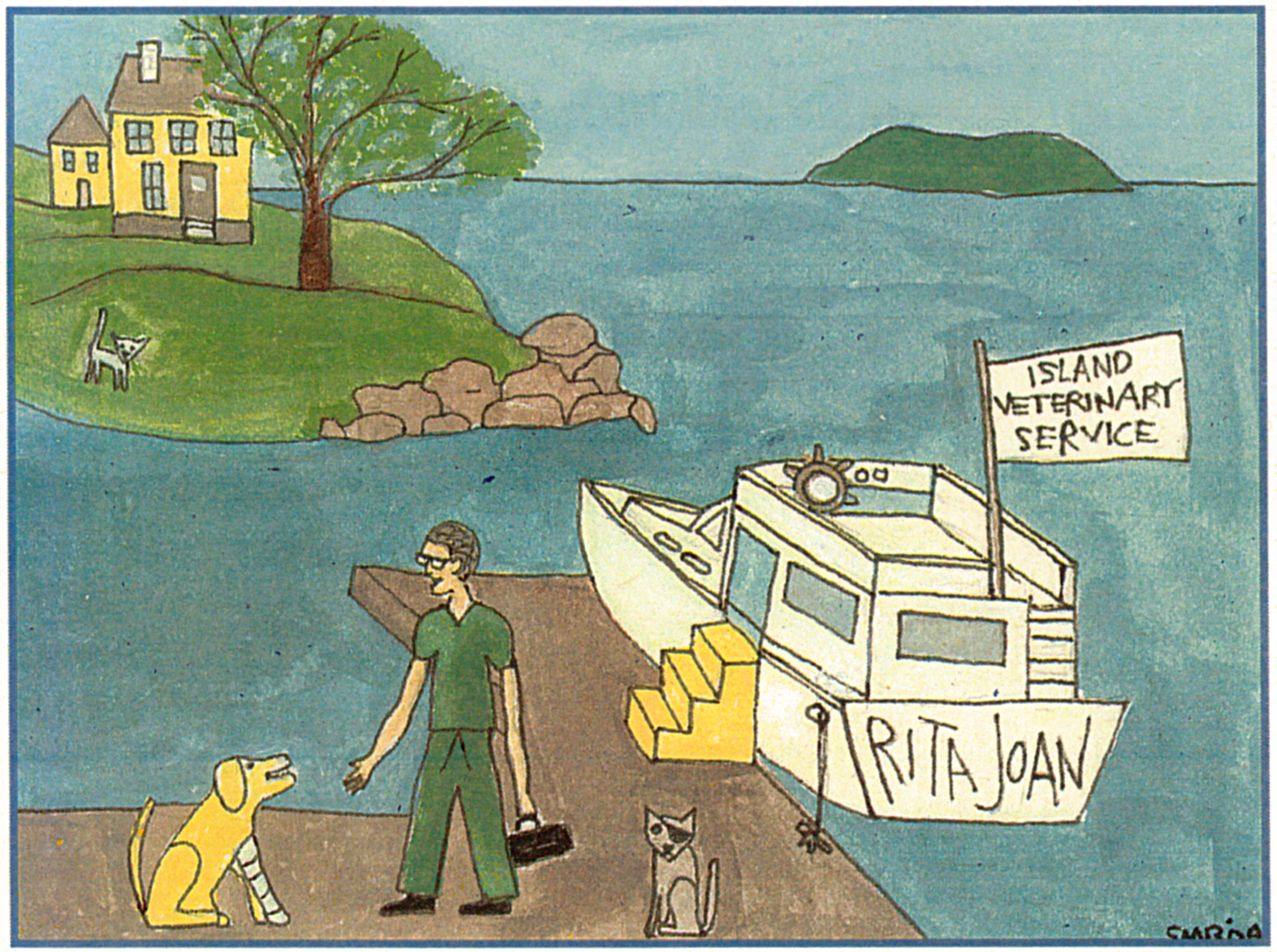 For 10 or 12 years, I’m a little foggy on what year we really began; the crew and I have been steaming around Casco Bay tending to the animals that live on the islands. We have worked on fishing boats that have rafted up next to us, public docks, private homes and mostly around the exam table on the “Rita Joan”. Over the years there has been a gradual down sizing of both the crew and the vessel. We started on a 37′ Albin trawler equipped as if we were going around the world. We now work out of a small efficient Eastern 27 . When working on the islands we did our best with whatever patients were presented. We have cared for farm animals and pets, stranded loons and feral cats, gerbils and (God help me for pretending I knew something about it)..a little kids toad. Here are a few of our stories about the critters, the care we provided and the folks that brought them to us.